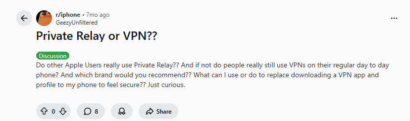 “Private Relay or VPN?? Do other Apple Users really use Private Relay?? And if not do people really still use VPNs on their regular day to day phone? And which brand would you recommend??”