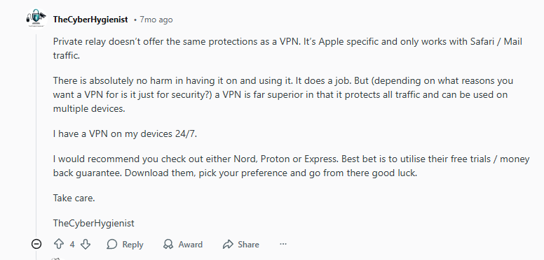 “Private relay doesn’t offer the same protections as a VPN. It’s Apple specific and only works with Safari / Mail traffic. There is absolutely no harm in having it on and using it. It does a job. But a VPN is far superior in that it protects all traffic and can be used on multiple devices.”