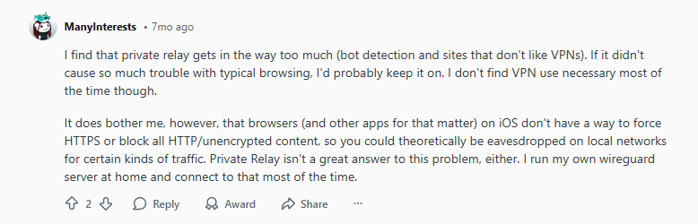 This user highlights a critical point: Private Relay doesn’t solve fundamental HTTPS issues. Modern VPNs often include “HTTPS enforcement” features that Private Relay lacks.