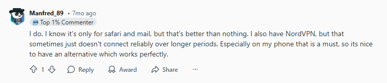 “I do. I know it’s only for safari and mail, but that’s better than nothing. I also have NordVPN, but that sometimes just doesn’t connect reliably over longer periods.”