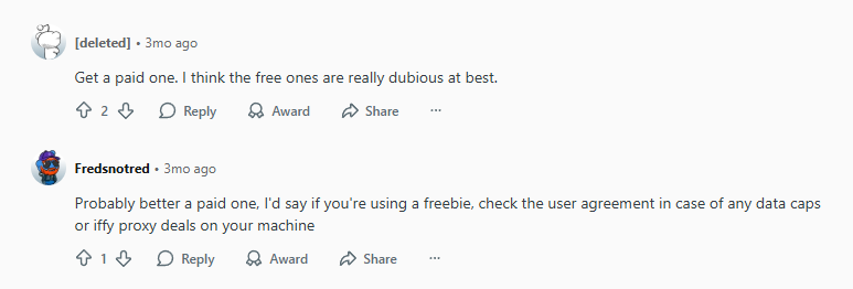 “Probably better a paid one, I’d say if you’re using a freebie, check the user agreement in case of any data caps or iffy proxy deals”
