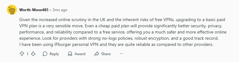 “Given the increased online scrutiny in the UK and the inherent risks of free VPNs, upgrading to a basic paid VPN plan is a very sensible move.”