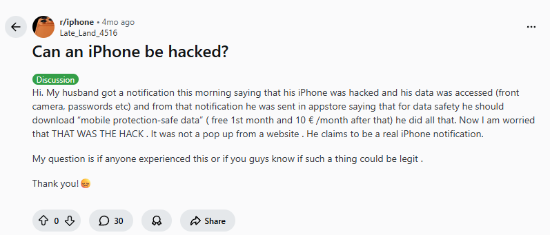 *”My husband got a notification this morning saying that his iPhone was hacked and his data was accessed (front camera, passwords etc) and from that notification he was sent in appstore saying that for data safety he should download ‘mobile protection-safe data’ (free 1st month and 10 € /month after that) he did all that. Now I’m worried that THAT WAS THE HACK.”*
