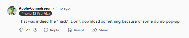 “That was indeed the ‘hack’. Don’t download something because of some dumb pop-up.”