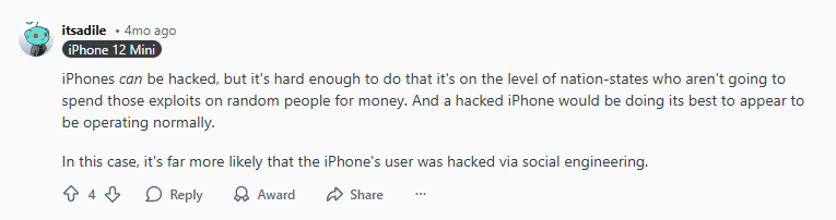 “iPhone’s can be hacked, but it’s hard enough to do that it’s on the level of nation-states who aren’t going to spend those exploits on random people for money. And a hacked iPhone would be doing its best to appear to be operating normally.”