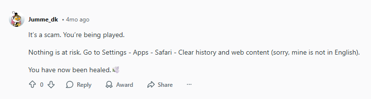 “It’s a scam. You’re being played. Nothing is at risk. Go to Settings – Apps – Safari – Clear history and web content… You have now been healed.”