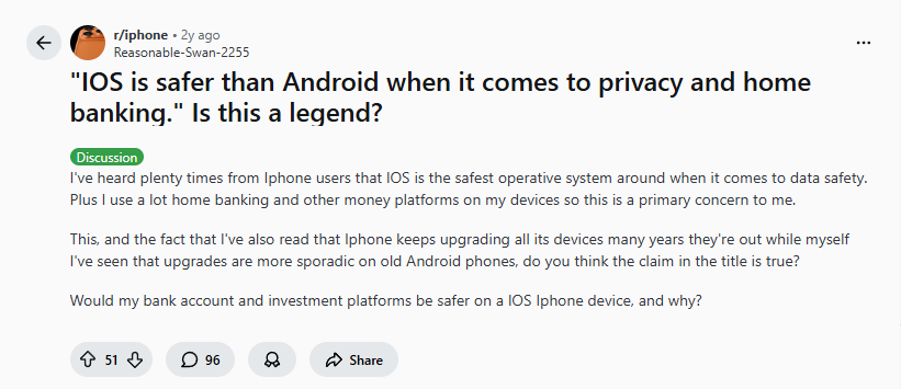 “IOS is safer than Android when it comes to privacy and home banking.” Is this a legend? I’ve heard plenty times from Iphone users that IOS is the safest operative system around when it comes to data safety. Plus I use a lot home banking and other money platforms on my devices so this is a primary concern to me.”