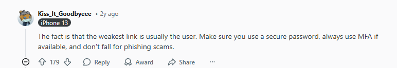 “The fact is that the weakest link is usually the user. Make sure you use a secure password, always use MFA if available, and don’t fall for phishing scams.”