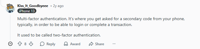 “Multi-factor authentication. It’s where you get asked for a secondary code from your phone, typically, in order to be able to login or complete a transaction. It used to be called two-factor authentication.”