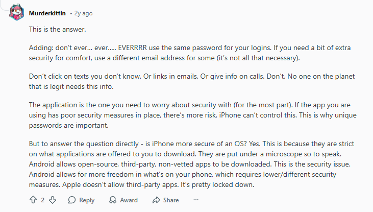 “But to answer the question directly – is iPhone more secure of an OS? Yes. This is because they are strict on what applications are offered to you to download. They are put under a microscope so to speak… Apple doesn’t allow third-party apps. It’s pretty locked down.”
