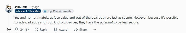 “Yes and no – ultimately, at face value and out of the box, both are just as secure. However, because it’s possible to sideload apps and root Android devices, they have the potential to be less secure.”