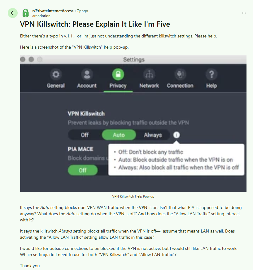 But not all emergency brakes are created equal. The core problem was perfectly summarized by a frustrated user trying to configure Private Internet Access: