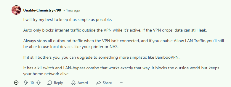 “Either there’s a typo or I’m just not understanding the different kill switch settings. Please help. It says the Auto setting blocks non-VPN traffic when the VPN is on. Isn’t that what the VPN is supposed to be doing anyway?”