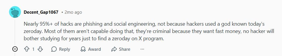 Despite advances in AI and defensive tech, one harsh reality remains unchanged: the majority of successful breaches don’t start with a complex zero-day exploit. They start with a simple human mistake. As another user bluntly stated: