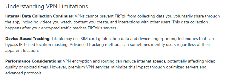 - Internal Data Collection Continues: VPNs cannot prevent TikTok from collecting data you voluntarily share through the app
